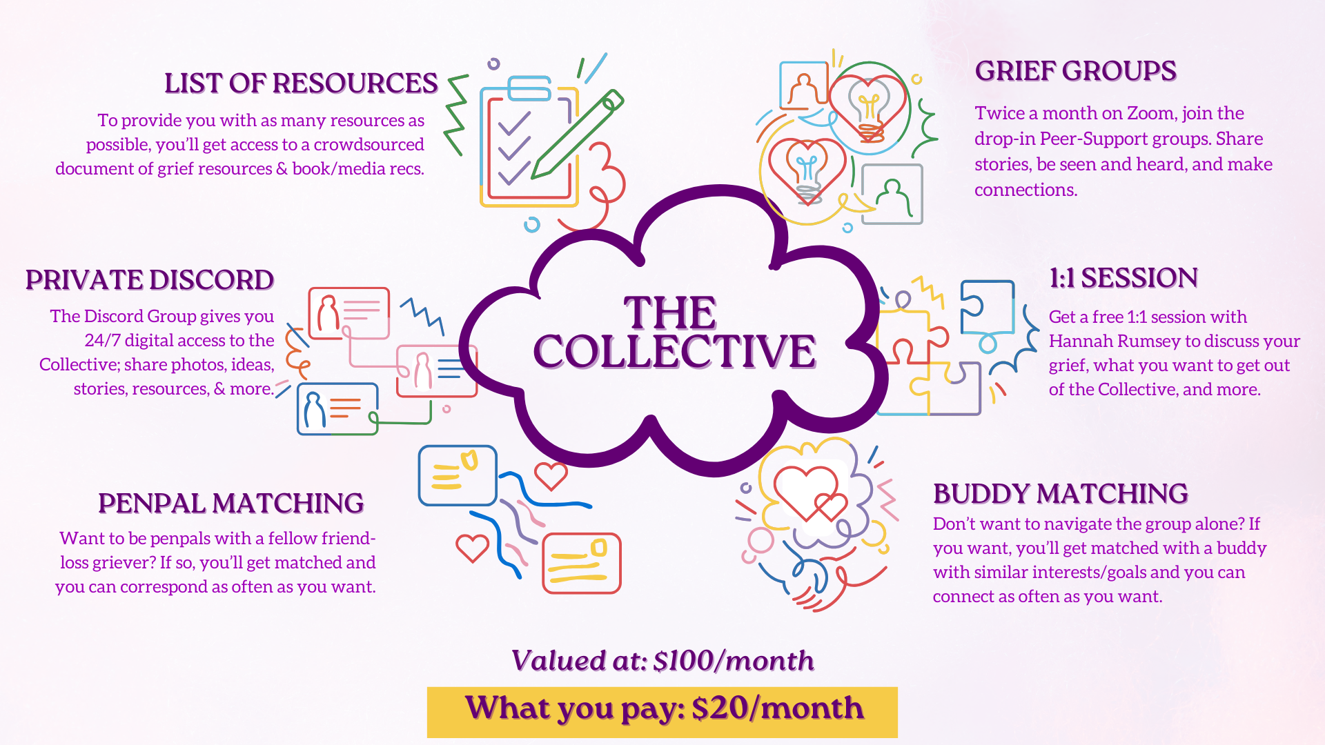 For only $20/month, join a collective of friend-loss grievers from around the world. Get access to grief groups, 1:1 support, resources, and more.